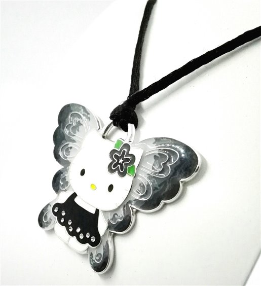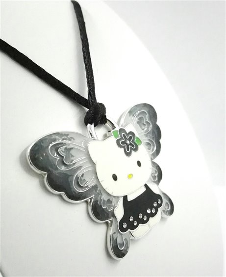 HELLO KITTY NECKLACE Butterfly Kitty collection. Black Satin Necklace with Hello Kitty Butterfly Pendant Necklace in 925 ‰ silver with white, gray and black enamel. The Hello Kitty dress is embellished with Swarovski. 925% silver carnelian closure. Hello Kitty pendant length 3.50 cm. Width wings Hello Kitty 4.70. Made in Italy.