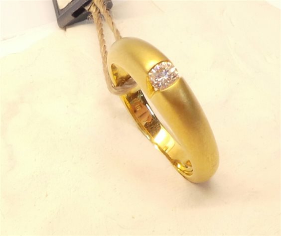 Brushed yellow gold ring 750% and glossy inside. The diamond is embedded in a "V" so you can admire all its faces and the characteristic diamond tip. Measure 15 modifiable. Guarantee and Certificate of Authenticity Salvini with insurance (robbery and strike) and original box.