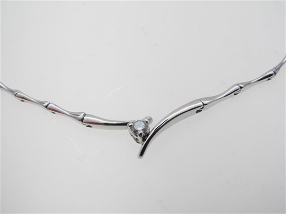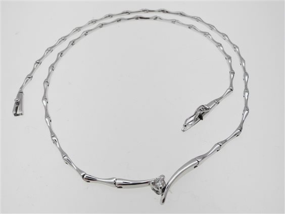 Collier in oro bianco 750 kt. con diamante centrale taglio brillante ct. 0,10. Chiusura a baionetta con un otto di sicurezza. Astuccio e garanzia di negozio.