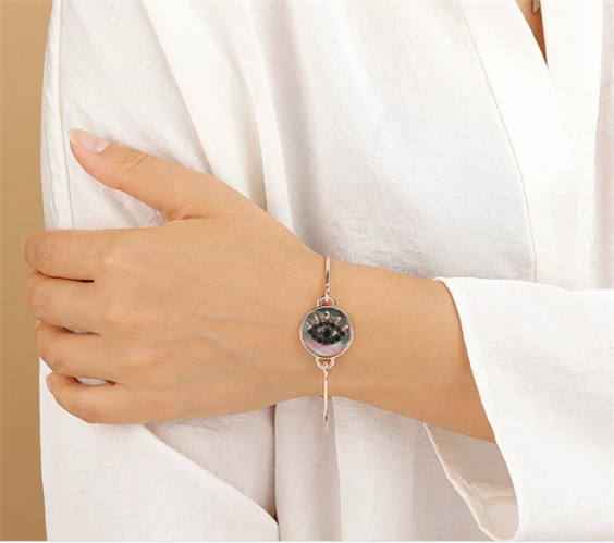 Il simpatico bracciale semi rigido con madreperla a scelta bianca o nera e icona a forma di occhio ha luminosi cubic zirconia o brillanti spinelli neri: l'esempio perfetto dei nuovi classici Bronzallure, riprende il design a disco tipico della collezione Alba, best seller del brand, e lo rende unico e accattivante grazie all'elemento a forma di occhio. Disponibile anche con altri soggetti, il bracciale con extender semi rigido oro rosa placcato oro 18kt è un gioielllo originale con madreperla nera o bianca, irriverente e fuori dall'ordinario. La placcatura oro rosa su lega brevettata è ipoallergenica, nickel free e cadmium free; la placcatura è luminosa e femminile e dona ai gioielli con pietre Bronzallure tonalità uniche e straordinarie.