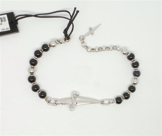 BRACCIALE IN ARGENTO LUCIDO E RODIATO CON PIETRE DURE ONICE LUCIDA DIAMETRO 6 ,LUNGHEZZA REGOLABILE ,CHIUSURA CON MOSCHETTONE , CENTRALE CON SPADA DI CM 4,5 X 0.5. POSSIBILITA' DI AVERE LA COLLANA