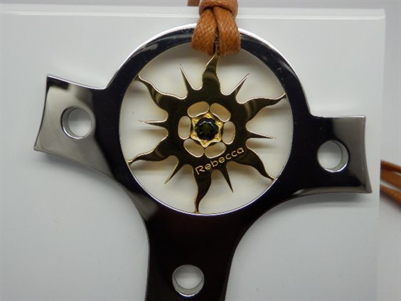 Collana con in cuio marrone con pendente a forma di croce TAO con centrale sole stilizzato in tribeca (lega di carbonio, zinco, vanadio ed oro) con quarzo idrotermale incassato colore verde.